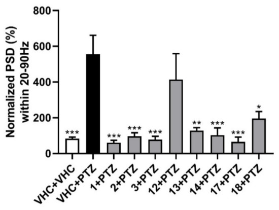 Electrophysiological antiseizure analysis of coumarins used in this study. Non-invasive local field potential recordings from the optic tectum of larvae pre-exposed to vehicle (VHC) only, VHC and pentylenetetrazole (PTZ), or test compound and PTZ. Normalized power spectral density (PSD) in defined frequency band of 20–90 Hz per individual larva is shown (mean ± SEM). Number of replicates: n = 9–10 for each compound group and n = 29–30 for the VHC + VHC and VHC + PTZ controls. Statistical analysis: one-way ANOVA with Dunnett’s multiple comparisons test (GraphPad Prism 7). Significance levels: * p < 0.05; ** p < 0.01; *** p < 0.001.