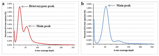 Figure 1. Distribution of the 17-mer frequency. (a) the k-mer frequency distribution of the heterozygous parent; (b) the k-mer frequency distribution of the doubled haploid.