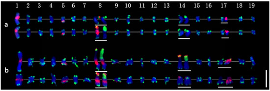 Figure 4. Molecular karyotypes of P. xiaohei and the derived doubled haploid. (a) Populus simonii × P. nigra; (b) Doubled haploid Populus simonii × P. nigra. Chromosomes 1–19 are arranged from left to right, and homologous or homeologous chromosomes are arranged from top to bottom. In the chromosomes with white lines below, the first FISH result is shown on the left (same as in Figure 3b,e), and the second FISH result is the chromosome shown on the right (same as in Figure 3c,f). Bar = 5 μm.