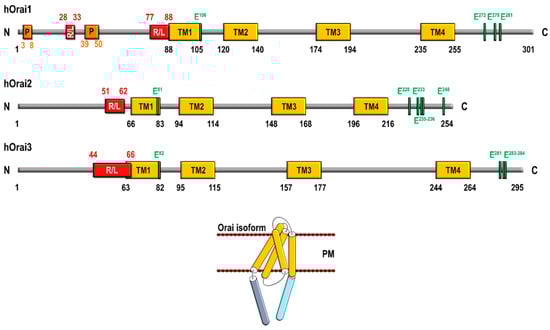 - Bergsmann, J.; Derler, I.; Muik, M.; Frischauf, I.; Fahrner, M.; Pollheimer, P.; Schwarzinger, C.; Gruber, H.J.; Groschner, K.; Romanin, C. Molecular Determinants within N Terminus of Orai3 Protein That Control Channel Activation and Gating. J. Biol. Chem. 2011, 286, 31565–31575. [Google Scholar] [CrossRef]