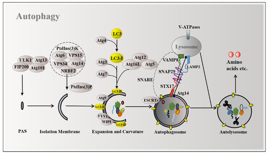 Overall, the molecular mechanism of the autophagy process is carried out by autophagy-related genes (Atgs) and several critical complexes (Figure 1) [11]. Autophagy steps are hierarchically controlled by two complexes: namely the unc-51-like kinase 1 (ULK1) complex [10] and class III phosphatidylinositol 3-kinase (PtdIns(3)K) complex [12], as well as by two ubiquitin-like conjugation systems, namely the Atg8-lipid phosphatidylethanolamine (PE) and Atg12-Atg5 systems [13]. Firstly, the ULK1 serine threonine kinase complex (involving ULK1, FIP200, Atg13, and Atg101) regulates the onset of PAS by transducing the signals regulating the phosphorylation or recruitment of autophagosome formation proteins to induce autophagy [2,14]. Secondly, PAS is modified by phosphatidylinositol 3-phosphate (PtdIns(3)P) produced under the promotion of the phosphatidylinositol 3-kinase (PtdIns(3)K) complex containing the vacuolar protein sorting 34 (VPS34)/phosphatidylinositol 3-kinase catalytic subunit type 3 (PIK3C3), Atg6/Beclin1, Atg14/Barkor, VPS15/phosphoinositide-3-kinase regulatory subunit 4 (PIK3R4), and the fifth subunit nuclear receptor binding factor 2 (NRBF2)/Atg38 [15]. VPS34 plays an important role in the extension of autophagic vesicle membranes and the recruitment of Atg proteins to autophagic vesicles. Thirdly, two ubiquitin-like systems (a class of low molecular weight proteins to molecule undergo specific modifications to target proteins under the action of a series of specific enzymes), consisting of Atg5, Atg12, Atg16L, Atg7, Atg3, and Atg4, regulate the expansion of phagophore by lipidating the microtubule-associated protein light chain 3-I (LC3-I) to LC3-II [16]. The C-terminal glycine, when exposed to LC3 synthesized early and connected by Atg4, forms a cytoplasmic soluble LC3-I. After autophagy induction, LC3-I is conjugated with substrate PE on the surface of the autophagy membrane under the joint action of E1-like enzyme Atg7, E2-like enzyme Atg3, and the E3-like enzyme Atg5-Atg12-Atg16L complex to form membrane-binding LC3-II. As such, LC3-II is an important marker of autophagosomes, which increases with the increase in the autophagosome membrane. Atg9 may function by generating the highly curved vesicular intermediate, which is indispensable during phagophore growth [17]. WD-repeat protein interacting with phosphoinositide (WIPI), a kind of PI(3)P-binding autophagy protein [18], and FYVE (the PI(3)P sensor) [19] can directly bind to the phagophore membrane surface through its transmembrane domain to relegate the sensor to a ring around nascent phagophores. Fourthly, the endosomal sorting complexes required for transport (ESCRT) proteins, which function to constrict and sever narrow membrane necks, are recruited to close phagophores through interacting with PtdIns(3)P [20]. The next step is the fusion of the autophagosome with lysosome to break down the cargo. The soluble N-ethylmaleimide-sensitive factor attachment protein receptor (SNARE) proteins further promotes specific membrane fusion, forming Qa-, Qb-, Qc-, and R-SNARE. The Qa-SNARE syntaxin 17 (STX17) can be inserted into completed autophagosomes via its unusual C-terminal hairpin-like structure and mediates autophagosome–lysosome fusion by binding to its partner soluble NSF attachment protein 29 (SNAP29; Qbc-SNARE) and vesicle-associated membrane protein 8 (VAMP8; R-SNARE) [21]. Recently, it has been reported that ATG14 interacts with SNAP29 as well as the t-SNARE complex consisting of STX17 and SNAP29 in vitro, co-localizing with STX17 on the mature autophagosome directly [22]. After the autophagosome fuses with the lysosome, the last step is the degradation of the contents in the autolysosome. The autolysosome degrades macromolecules to nutrients for the cell and the targeted hydrolase is activated within the lysosome’s high acidic pH environment (between 4.5 and 5.0). Acidification of the lysosome is maintained by the lysosomal membrane proteins, such as lysosomal-associated membrane protein 1 (LAMP1) and LAMP2, and more importantly the vacuolar-type H (+)-ATPases (V-ATPases) [23]. Orchestration of Spns1 and the V-ATPase optimize acidification during autolysosomal biogenesis [21].