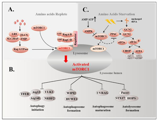 Classical amino acid sensing pathways regulate autophagy. (A) The abundant amino acids activate the Ragulator complex to promote the most active amino acid sensors, including SLC38A9, LRS, and FLCN-FNIP to RagGTPases, in which RagA/B binds to GTP and RagC/D to GDP, which recruits mTORC1 to the lysosome and is activated, thereby inhibiting autophagy. (The red arrow refers to the caption below, meaning the mTORC1 is activated in the lysosome.) (B) The mTORC1 activated by the abundant amino acids inhibits autophagy-related proteins, which are related with autophagy initiation, autophagosome formation, autophagosome maturation and autolysosome formation. (C) Amino acid starvation prevents the translocation of mTORC1 to the surface of the lysosome and inhibits its activity. GCN2 kinase binds to the elevated uncharged tRNA to be activated, then phosphorylates eIF2α and upregulates the transcriptional activities of ATF4 and CHOP to induce autophagy.
