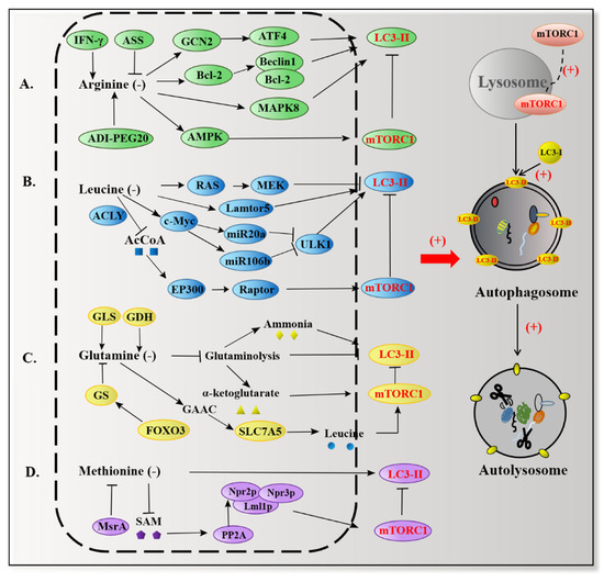 Amino acids, by activating the mammalian target of rapamycin (mTOR) kinase, regulate autophagy. It has been shown that autophagy is induced by GCN2 and mTORC1 pathways; as we all know how mTORC1 regulates autophagy, signal transduction of the mTORC1 pathway could be used for targets that are not equally sensitive to all amino acids. Amino acids are classically divided into essential and nonessential amino acids, according to whether they can be synthesized by the body itself. In addition, researchers define functional amino acids as those that participate in and regulate key metabolic pathways to improve the health of an organism and are also involved in the prevention and treatment of metabolic diseases, such as obesity, diabetes, and cardiovascular disease [45]; thus, from the mechanisms of major functional amino acids (e.g., arginine, leucine, glutamine and methionine) regulating mTORC1 through different signal transduction pathways, signal transduction pathways of FAAs are expected to be potential therapeutic targets for autophagy-related diseases in the future.