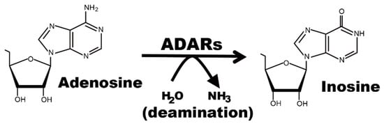 Adenosine-to-inosine RNA editing. Adenosine deaminases acting on RNA (ADARs) convert adenosine into inosine through a deamination reaction.