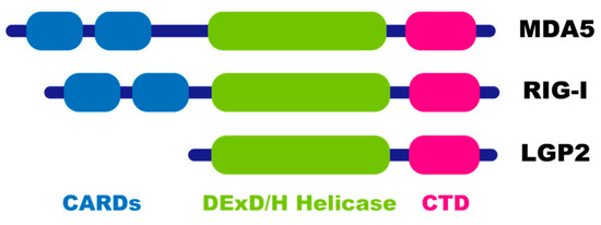 Structural representation of retinoic acid-inducible gene I (RIG-I)-like receptor family members. Melanoma differentiation-associated protein 5 (MDA5) and RIG-I comprise two caspase activation and recruitment domains (CARDs; shown in blue), which mediate signal transduction through interaction with the mitochondrial antiviral-signaling protein (MAVS), with a DExD/H-box RNA helicase domain (light green) and a C-terminal domain (CTD; shown in pink), both of which are required for RNA binding. LGP2 lacks CARDs.