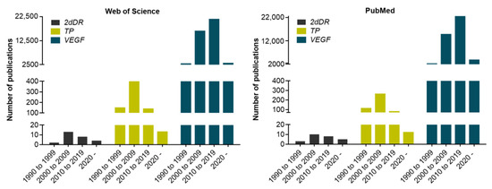Distribution of angiogenesis-related publications using the WoS and PubMed databases on 2dDR, TP and VEGF from 1990 to date.