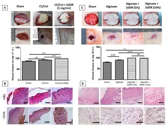 Gross, histological and graphical representation of wound closure analysis of animal studies. (A) Macroscopic analysis and (B) H&E staining and immunostaining with CD34 marker of the wounds showing the healing of cutaneous wounds in 17 days when treated with 2dDR-loaded CS/Collagen hydrogels (n = 3). (C) Macroscopic analysis and (D) H&E staining and immunostaining with CD34 marker showing the healing of diabetic wounds in 20 days when treated with 2dDR-loaded alginate dressings (n = 4). Scale bars represent 100 µm. Results are presented as mean ± SD where *** p < 0.001, ϕϕϕ p < 0.001, ααα p < 0.001, ns p > 0.05 (not significant). Images, used in (A,B), are adapted from [29] with permission granted by Materials Today Communications, Copyright 2017 Elsevier. Images, used in (C,D), are adapted from [33] with permission granted by Journal of Biomaterials Applications, Copyright 2019 Sage Publications.
