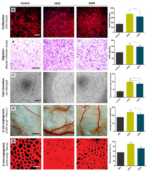 Representative images demonstrating the pro-angiogenic potential of 2dDR compared to VEGF in terms of stimulating the (A) proliferation, (B) migration, (C) tube formation of HAECs, and in vivo angiogenesis assessed by (D) macro vessels and (E) microvasculature in ex ovo CAM bioassay. (*** p ≤ 0.001, ** p ≤ 0.01, * p ≤ 0.05, ns: not significant, n = 3). Scale bars represent 200 μm for proliferation, 250 μm for migration and tube formation images, 2 mm for macro and 50 μm for confocal microvessel images of CAM bioassay. Images, used in (A,D), are adapted from [32] with permission granted by Microvascular Research, Copyright 2020 Elsevier. Images, used in (E), is adapted from [30] with permission granted by Regenerative Medicine, Copyright 2019 Future Medicine.
