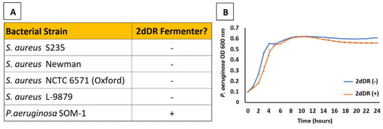 (A) Among the four strains of S. aureus tested, none were capable of fermenting 2dDR whilst the P. aeruginosa strain was a fermenter of 2dDR [29]. (B) Growth curves measuring optical density (absorbance at 600 nm) of P. aeruginosa SOM-1 over 24 h in media supplemented with and without 2dDR reveal that there is no effect of growth of this strain. Error bars represent the SEM (n = 3).