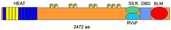 Schematic linear representation of the human replication timing regulatory protein 1 (RIF1). It has 2472 aa and contains conserved domains: HEAT (huntingtin, elongation factor 3, a subunit of protein phosphatase 2A and TOR)/Armadillo-like helical repeats) with its core conserved subdomains in yellow, SILK-RVxF domain, which is a docking motif for protein phosphatase 1 (PP1), DNA binding domain (DBD) and the BLM interacting domain involved in recruiting the BLM helicase to stalled replication fork. At least three clusters of sites of phosphorylation, essential for RIF1 activity, can be considered, and their approximate positions are indicated with circled “P”s (https://www.phosphosite.org/proteinAction.action?id=6427&showAllSites=true, accessed on 19 October 2021). All these domains are only presented with approximate locations and scale.