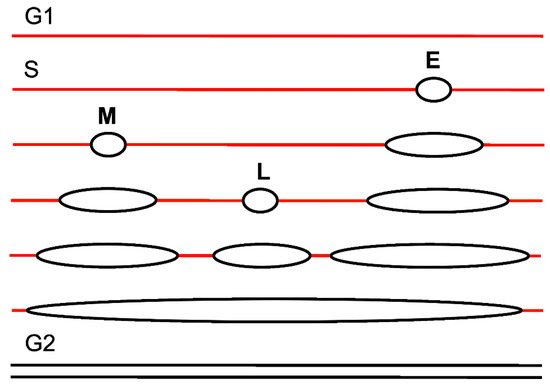 Simplified idea of replication timing. In this scheme, a red or black single line represents a parent or daughter double-stranded DNA, respectively. In late G1, a DNA molecule is ready to replicate and enter S phase. In S, some origins of replication are early activated (fired) and represented here for just a single origin (E). Then some other origins are fired, which are also represented by a single origin (M) and replication initiated in E prolongs. Next, further origins are fired (L), when replications are initiated at E and M progress. If the replication is not disturbed, the cell enters G2 phase with completely replicated DNA. Such an order of events spares energy and decreases the chance of steric conflict between proteins involved in replication initiation.