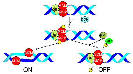 As mentioned, the initiation of DNA replication requires activities of DDK targeting the MCM2-7 proteins. Alver et al. showed RIF1-mediated MCM dephosphorylation at replication fork [65]. RIF1 guided PP1 to chromatin to invert DDK-mediated phosphorylation of MCM, i.e., to inhibit initiation of DNA replication (Figure 3). RIF1 depletion increased phosphorylation of MCM and the rate of origin firing. In conclusion, replication initiation and replisome stability depended on the state of MCM phosphorylation, which was maintained by the balance between phosphorylation and dephosphorylation of MCM at replication fork, mediated by DDK and RIF1, respectively.