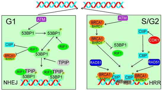 Escribano-Diaz et al. showed that TP53BP1 suppressed BRCA1 accumulation at DSB sites in G1 [116]. ATM-dependent phosphorylation of TP53BP1 recruited RIF1 and TPIP to DSB sites, which are critical effector of TP53BP1 in DSBR. These authors also showed that BRCA1 and CtIP antagonized RIF1 accumulation at DSB sites. PTIP contains the BRCT (BRCA1 C-terminal) domain, facilitating its interaction with TP53BP1 [117]. The relationship between TP53BP1, RIF1, and TPIP is not fully known, and likely complex [118]. Moreover, RIF1 depletion restored end resection and RAD51 (RAD51 recombinase), a critical HRR protein, loading in BRCA1-depleted cells. This work presented RIF1 and BRCA1 as critical elements of DSBR pathway choice to favor NHEJ in G1 phase and HRR in S phase of the cell cycle (Figure 6).