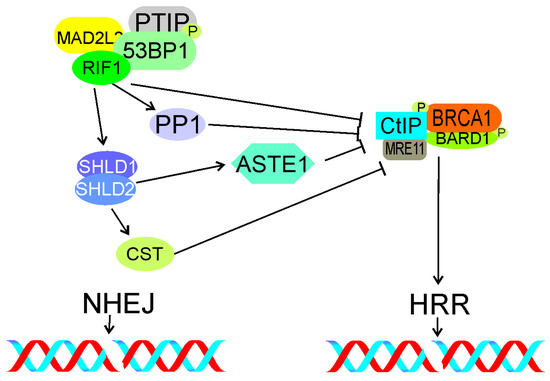Mirman et al. showed that the CST complex consisting of CTC1 (CST telomere replication complex component 1), STN1 (STN1 subunit of CST complex), and TEN1 (TEN1 subunit of CST complex), an accessory factor of the polymerase α-primase complex, was a downstream effector of the TP53BP1-RIF1-shieldin pathway-regulating end resection [130]. Depletion of CST caused an increased end resection similarly to loss of RIF1, TP53BP1, or shieldin. Therefore, CST may assist RIF1, TP53BP1, and shieldin in DSBR regulation (Figure 7).