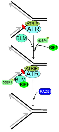 Xu et al. showed that RIF1 was part of a multiprotein complex to maintain genomic stability and the BLM complex, containing the BLM helicase [21,150]. Human RIF1 and BLM were recruited to ICLs with the same rate, and the majority of them were colocalized [21] (Figure 8). RIF1 cooperated with BLM to recover the stalled replication fork. The stability of RIF1 depended on the BLM complex. Although there was a direct interaction between the C-terminal domain of RIF1 and the BLM complex, RIF1 was also recruited, although less efficiently, for the stalled replication fork in the absence of BLM. Although previously Buonomo et al. showed that RIF1 colocalized with TP53BP1 and a fraction of BLM, Xu et al. observed that TP53BP1 was not a part of the BLM complex and might be separately recruited to the stalled replication fork [32,151]. In conclusion, RIF1 and BLM worked in the same pathway to prevent damage accumulation and promoted reactivation of stalled replication forks.