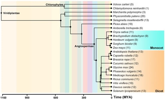 Phylogeny distribution of DUF506 genes across 23 species used in this study. The number of high confidence DUF506 genes is listed in parentheses. The order of tree branches and divergence time are derived from the TimeTree database (http://www.timetree.org/, accessed on August 2021). Monocot species are highlighted in the rectangle of teal color, whereas the dicot species are masked by rectangle in yellow color.
