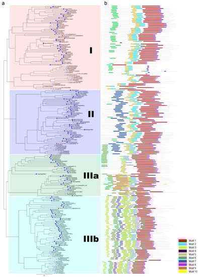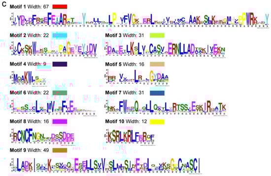 Within the DUF506 family, ten putative conserved motifs between five and one hundred amino acid residues were predicted using MEME []. The corresponding motif sequence logos and their distribution along the sequence are illustrated in Figure 2b,c. Generally, group Ⅲa DUF506 members had the highest motif abundance. The most ubiquitous was motif 4 and was present in all (211/211) DUF506 proteins, while motif 1 (204/211), motif 2 (184/211), and motif 5 (203/211) were present in most DUF506 proteins. In contrast, motifs 7 and 9 were exclusively found in group Ⅰ and Ⅲa, respectively. Motifs 3, 6, 8, and 10 were present only in group Ⅲb. Overall, DUF506 members from the same groups generally share distinctive motif compositions, indicating that functional similarities within groups and the diversification among groups.
