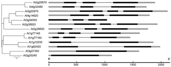 The localization of DUF506 genes on Arabidopsis chromosomes was visualized through ePlant website (https://bar.utoronto.ca/eplant/, accessed on May 2021). The thirteen Arabidopsis DUF506 genes were found on chromosomes 1–4 (Figure S1).