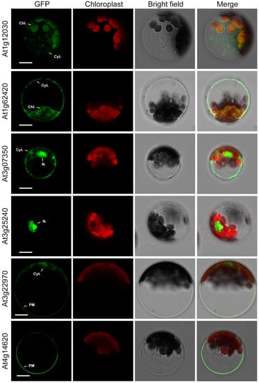 To study the subcellular localization of DUF506 proteins in Arabidopsis, six representative Arabidopsis DUF506 genes were cloned and transferred into the pEarleyGate 103 plasmid [] to generate AtDUF506-GFP fused proteins driven by the CaMV35S promoter. Constructs were individually introduced into Arabidopsis mesophyll protoplasts using polyethylene glycol (PEG)-mediated transfection []. The resulting transient expression patterns are shown in Figure 4. The duplicated gene pairs were consistently expressed in identical organelles. For instance, At1g12030 and At1g62420 were localized in both the chloroplast and cytoplasm, while At3g22970 and At4g14620 were mainly in the plasma membrane, and slightly in the cytoplasm. Conversely, At3g25240 was concentrated in the nucleus and At3g07350 was present in the nucleus and cytoplasm. These results suggest that DUF506 proteins play diverse physiological roles based on their distinct patterns of organelle localization.