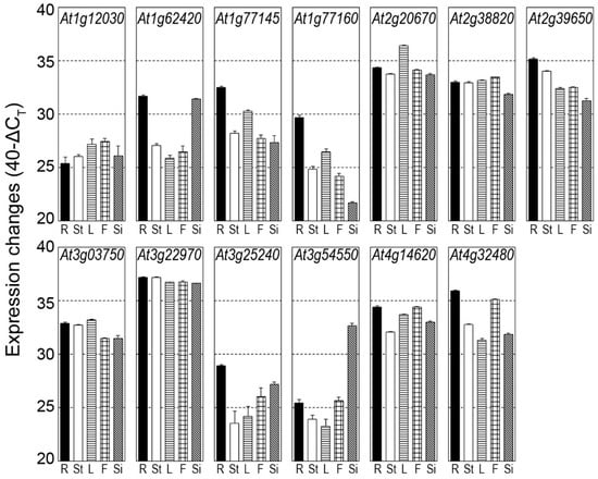 Expression profile of Arabidopsis DUF506 genes in different tissues. R, root; St, stem; L, leave; F, flower; Si, silique. Changes of gene expression level between tissues are interpreted as described in []. Expression levels are given on a log scale expressed as 40−ΔCT, where ΔCT is the difference in qRT-PCR threshold cycle number between the respective gene and the reference gene (GAPDH); 40 therefore equals the expression level of GAPDH; the number 40 was chosen because the PCR run stops after 40 cycles. The fold difference in expression is 2ΔΔCT when PCR efficiency is 2 (e.g., an ordinate value of 34 represents 16-fold lower expression than a value of 38).