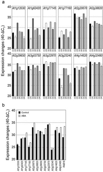 Abscisic acid (ABA) has been shown to play an important role in stress responses and tolerance to abiotic stresses []. Most of the salt stress responsive Arabidopsis DUF506 genes, including At1g77145, At1g77160, At2g20670, At2g38820, At3g07350, and At4g14620, positively responded to ABA treatment, while At1g62420, At2g39650, and At3g25240 did not (Figure 6b). Meanwhile, expression of Arabidopsis DUF506 genes were explored under heat and cold stress available through online public transcriptome databases (GENEVESTIGATOR® and EMBL-EBI/ArrayExpress). At3g25240 and At1g62420 were highly induced, but At2g20670 and At3g07350 were significantly repressed by both temperature stress conditions (FC ≥ 2).
