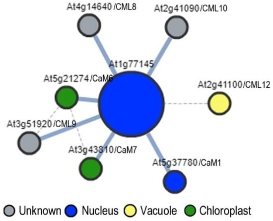 Predicted protein-protein interactions of At1g77145 and calmodulin/-like (CaM/CML). The interaction was predicted using AI-1 and the graph was generated by Arabidopsis interactions viewer (https://bar.utoronto.ca/interactions/cgi-bin/arabidopsis_interactions_viewer.cgi, accessed on June 2021). The color of nodes represents the subcellular localization predicted by SUBA (http://suba.live/, accessed on June 2021), and the thickness of lines represents the confident values of interactions. At2g41090, calmodulin like 10/CML10; At2g41100, calmodulin like 12/CML12; At3g43810, calmodulin 7/CaM7; At3g51920, calmodulin like 9/CML9; At4g14640, calmodulin like 8/CML8; At5g21274, calmodulin 6/CaM6; At5g37780, calmodulin 1/CaM1.