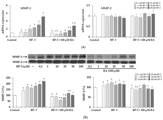 The significant increases in the expression of the gene encoding MMP-1 (Figure 10a) and MMP-1 protein (Figure 10b) as well as the activity of this collagenase (Figure 10c) found with all concentrations of BP-3 were partially or completely inhibited by 100 µM RA. The inhibitory effect on MMP-1 activity demonstrated in the presence of 100 µM RA was noted not only in relation to the all corresponding samples treated with BP-3 alone, but also compared to the controls. In turn, MMP-2 expression at mRNA level was not significantly affected by either treatment with BP-3 alone or BP-3 in combination with RA (Figure 10a). However, the protein level (Figure 10b) and activity of this enzyme (Figure 10c) were higher in the culture media treated with all concentrations of BP-3 than in the control. Moreover, 100 µM RA provided (with the exception of one sample treated with 25 µM BP-3) complete protection against the stimulatory effect of this sun filter on enzyme expression and significantly reduced the activity induced by all BP-3 concentrations relative to both the corresponding samples treated with BP-3 alone and untreated controls.