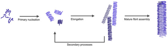 Amyloid fibrils are often described as having a distinct morphology with different arrangements of twisted or parallel assemblies of thinner filaments [11]. Mature amyloid fibers form stepwise (Figure 1); starting with individual monomers of αSyn lumping together to form nuclei/oligomers (primary nucleation), these oligomers can bind additional monomers resulting in long individual fibers (elongation). Additionally, the process can be catalyzed by secondary processes; the surface of already formed fibers can work as a catalyst for the formation of new nuclei (secondary nucleation) and long fibers can break into shorter fragments creating new growing ends (fragmentation) [12,13]. Next, individual fibers can associate together to form thicker (mature) fibers. The assembly of thin fibers (often called protofilaments) into mature fibers gives rise to a periodicity in the fibrillar structure (denoted as pitch), which can be detected and measured by atomic force microscopy (AFM) or cryo-electron microscopy [14,15]. High resolution structures of αSyn fibrils, recently obtained by cryo-electron microscopy and solid state nuclear magnetic resonance (NMR) [16,17], have demonstrated that the observed pitch is created by intertwining of protofilaments (Table S1, for reported pitch values of αSyn amyloids). Variations in the arrangement of individual fibers relative each other, along with internal fiber differences, give rise to different fiber morphologies. External factors such as pH, ionic strength, and metals may affect the kinetics and pathways of αSyn amyloid formation, as well as the internal structure, pitch, and morphology of resulting fibers [18]. NMR data have suggested that differences in protein backbone conformation, salt bridges and electrostatic interactions between protofilaments relate with different polymorphs of αSyn amyloid fibers. This is important to study further as different morphologies of fibrils have been suggested to correlate with difference in cell toxicity [19].