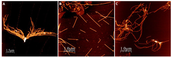 AFM images of amyloid fibrils formed after 90 h aggregation in pH 7.4. (A) Ac αSyn, (B) Ac αSyn + NaAsO2 1:10, (C) Ac αSyn + CdCl2 1:10.