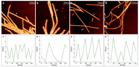 Measurement of fiber pitch in AFM images. (A,B) Ac αSyn with two distinct pitch types, (a) is showing the shorter pitch, (b) the longer pitch, (C) Ac αSyn + NaAsO2 1:10, (D) Ac αSyn + CdCl2 1:10. The pitch was measured as the distance between two maxima in the height curves. Heights are tracked along the indicated lines (a–d).