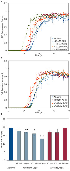 To address whether the metal ions also affect amyloid formation kinetics, we turned to time-resolved in vitro aggregation assays. We monitored the kinetics of amyloid formation using the Thioflavin T fluorescence (ThT) assay with 50 µM Ac αSyn as a function of NaAsO2 and CdCl2 (1:1 to 1:10 protein-to-metal ratio) concentrations at 37 °C under agitation with a glass bead at pH 7.4. The aggregation of Ac αSyn without added metals followed a sigmoidal trace similar to that for wild type αSyn [14,46] with a lag time of ~12 h and aggregation was completed by 30 h. In the presence of Cd(II), we observed metal concentration-dependent decrease of the lag time for Ac αSyn amyloid formation (down to ~7 h at the highest metal concentration) (Figure 4A,C). In the case of As(III), we detected apparent shorter lag times for 50 and 100 µM metal ions; however, the effect was not significantly different as compared to the aggregation kinetics of Ac αSyn alone (Figure 4B,C).