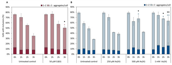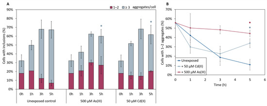 (A) In vivo aggregation of αSyn in metal exposed yeast cells. The αSyn-GFP localization was monitored in wild-type cells before and after 1, 3, and 5 h of exposure to either 500 µM NaAsO2 or 50 µM CdCl2. The fractions of cells containing aggregates (either 1–2 or ≥3 aggregates/cell) were determined by visual inspection of approx. 300 cells per condition. The error bars represent SD from three independent biological replicates. Significance is calculated with the unexposed cells as reference, (un-paired two-tailed student’s t-test, blue: ≥3 aggregates/cell; * p < 0.05). (B) Percentage of cells with 1–2 aggregates/cell out of the total percentage of cells with αSyn-GFP inclusions. Significance here refers to 1–2 aggregates/cell, red: 500 µM NaAsO2; light blue: 50 µM CdCl2, with * p < 0.05.