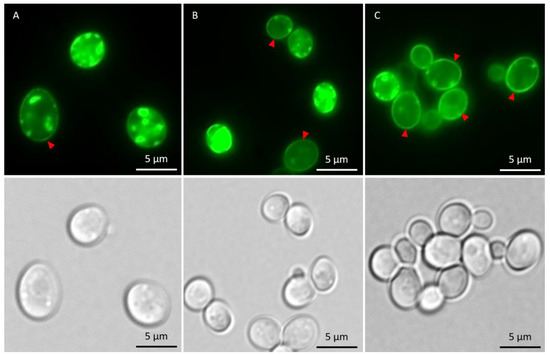 Fluorescent microscopy images showing αSyn-GFP in the cells in the absence of metal and after 5 h of metal stress. Cells with membrane-associated αSyn-GFP are indicated with red arrows. (A) αSyn-GFP cells without metal exposure. (B) αSyn-GFP cells + 50 µM CdCl2. (C) αSyn-GFP + 500 µM NaAsO2. The GFP-foci/aggregates were determined by visual inspection of 200 to 300 cells per condition and time point. Representative images are shown.