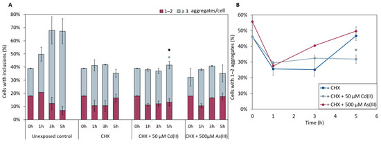 (A) In vivo aggregation of αSyn-GFP in the presence of 0.1 mg/mL of the protein synthesis inhibitor cycloheximide (CHX). αSyn-GFP foci localization was monitored after 0, 1, 3, and 5 h of exposure to either NaAsO2 or CdCl2. The fractions of cells containing aggregates (either 1–2 or ≥3 aggregates/cell) were determined by visual inspection of approx. 300 cells per condition. The error bars represent SD from three independent biological replicates. Significance is calculated with the untreated control as reference (un-paired two-tailed student’s t-test against CHX-treated cells, black: total fraction of cells with aggregates; blue: ≥3 aggregates/cell; * p < 0.05). (B) Percentage of 1–2 aggregates out of the total percentage of cells with αSyn-GFP inclusions when CHX is present in the cells. Significance here refers to 1–2 aggregates/cell, light blue: 50 µM CdCl2, with * p < 0.05.