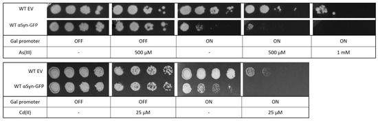 αSyn has been shown to be toxic to yeast cells [48], and we next addressed whether yeast expressing αSyn-GFP are more susceptible to metal stress as well. Yeast cells containing αSyn-GFP were grown overnight in a glucose medium (αSyn-GFP expression off) and then spotted onto agar plates with galactose (αSyn-GFP expression on) or without galactose (αSyn-GFP expression off) as well as different concentrations of As(III) and Cd(II). Cells expressing αSyn were somewhat more sensitive to both As(III) and Cd(II) than cells with the corresponding empty plasmid or cells in which αSyn-GFP expression is off (Figure 9). Thus, the presence of metals aggravates αSyn toxicity in yeast.