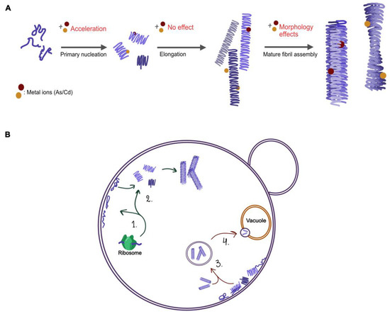 Illustration of the possible pathways in αSyn aggregation (A) and processes of αSyn in yeast (B) that might be affected by As(III) and Cd(II). (A) In vitro addition of Cd(II) accelerates the primary nucleation step; possible changes to the internal structure of single fibrils result in morphological changes to the mature amyloid fibers. (B) (1–2) the synthesis of αSyn and its interaction with plasma membranes, (3) the localization and relocation of aggregates, and (4) clearance of αSyn aggregates.