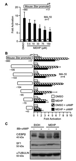 MEHP targets the proximal Star promoter in MA-10 Leydig cells. (A) MA-10 were transfected with a −980 bp mouse Star reporter and treated for 24 h with either dimethylsulfoxide (DMSO) or increasing concentrations of MEHP in the presence (black bars) or absence (white bars) of 0.1 mM 8Br-cAMP. Results are shown as fold activation over control. Values are the mean of seven individual experiments performed in triplicate (±SEM). (B) MEHP targets the proximal Star promoter. A series of 5′ progressive deletions of the mouse Star promoter were transfected in MA-10 Leydig cells and treated with either dimethylsulfoxide (DMSO, white bars) or 150 µM MEHP (gray bars) in the presence (hatched and black bars) or absence (white and gray bars) of 0.1 mM 8Br-cAMP. Results are shown as fold activation over control. Values are the mean of four individual experiments performed in triplicate (±SEM). (C) MA-10 Leydig cells were treated with either dimethylsulfoxide (DMSO) or 100 µM MEHP with or without 0.1 mM 8Br-cAMP and whole cell extracts were prepared for immunodetection of C/EBPβ and SF1. αTUBULIN was used as a loading control. All experiments were repeated three times and produced similar results. *: p ≤ 0.05.