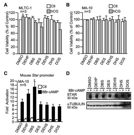 We next evaluated the impact of 100 µM of two commercial plasticizers, Hexamoll-DINCH and diethylhexyl adipate (DEHA), on Leydig cells. When compared with the control (DMSO), DEHA caused a decrease in cell viability in unstimulated and hCG-stimulated MLTC-1 cells (Figure 8A) while both Hexamoll-DINCH and DEHA caused a decrease in cell viability in unstimulated and hCG-stimulated MA-10 cells (Figure 8B). Luciferase reporter assays in MA-10 Leydig cells showed that DEHA and Hexamoll-DINCH do not significantly affect basal or cAMP-induced Star promoter activity (Figure 8C). STAR protein levels were not affected by the two commercial plasticizers (Figure 8D).