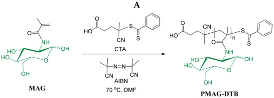 PMAG-DTB was synthesized by RAFT polymerization using 4-cyanopentanoic acid-4-dithiobenzoate as CTA, using the protocol developed in our group earlier [24]. The polymerization process was carried out at 70 °C with continuous stirring for 16 h using the following molar ratio of reagents: [MAG]:[DTB]:[AIBN] = 20:1:0.25. The scheme and conditions for the synthesis of PMAG-DTB are shown in Figure 1A. The molecular weight characteristics, determined by size-exclusion chromatography (SEC) with triple detection, are presented in Table 1 (sample #1). The structure of the homopolymer obtained was testified by 1H NMR spectroscopy (Figure S1, Supplementary Materials).