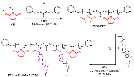 In order to prepare the block-copolymers containing a half amide of succinic acid in the side chain of the hydrophilic block, poly(N-vinylsuccinimide)-containing block-copolymers were initially synthesized as precursors. In this case, N-vinylsuccinimide (VSI) and ChMA were used as monomers, while S,S-dibenzyl trithiocarbonate was selected as CTA. It is known that symmetrical TTCs have two homolytic leaving groups and, consequently, after polymerization, the TTC function remains in the middle of the formed polymer. At the next copolymerization step, TTC causes the insertion of the second block in the middle of polymer chain, forming the ABA triblock-copolymer [53,54,55,56].