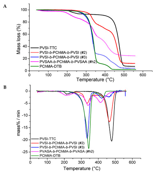 TGA (A) and DTG (B) plots for PVSI/PVSAA-containing copolymers with PChMA and corresponding homopolymers.