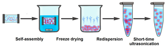 Nanoparticles (NPs) were obtained due to the self-assembly of amphiphilic copolymers by the gradient phase inversion method during the replacing of an organic solvent (dimethyl sulfoxide (DMSO), DMF, etc.) with water (Figure 8). In this case, the replacement of the solvent leads to progressive aggregation of the polymer due to the loss of solubility and the formation of a colloid. For storage, the dispersion was subjected to soft drying by solvent sublimation (lyophilization). Before application, an aqueous solution of interest was added to the weighted sample and redispersion of NPs under short-term ultrasound exposure (30–60 s) was performed.