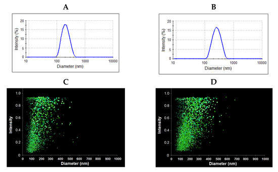 In all cases, the average hydrodynamic diameter (DH) and polydispersity index (PDI) were determined for nanoparticles lyophilized and redispersed in 0.01 M phosphate buffered saline (PBS) by dynamic light scattering (DLS) and nanoparticle tracking analysis (NTA). The results obtained are summarized in Table 2 and Figure 9. The results on the average hydrodynamic diameter obtained by both methods were in agreement with each other.