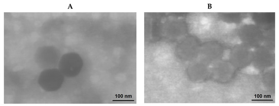 The morphology of nanoparticles was investigated using transmission electron microscopy (TEM) (Figure 10). In contrast to DLS and NTA providing the hydrodynamic diameter, TEM allows for the determination of the diameter of nanoparticles in a dry state. As expected, the hydrodynamic diameter of the nanoparticles under study was higher than the size determined in a dried state. This phenomenon is known for the soft materials, including micelles and polymersomes, from polymers of different nature [8,66,67,68]. The comparison of the images for nanoparticles obtained from PMAG-b-PChMA and PVSAA-b-PChMA-b-PVSAA makes it possible to distinguish some differences in their morphology. It is known from the literature that diblock-copolymers easily form micelles [69,70]. In turn, ABA copolymers, where A is a hydrophilic fragment and B is hydrophobic, are known to form nanoparticles of vesicular morphology [71]. Based on the literature data, it can be speculated that PMAG-b-PChMA and PVSAA-b-PChMA-b-PVSAA potentially form micelles and vesicles, respectively.
