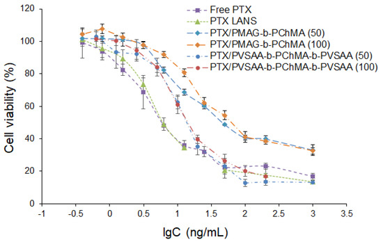The IC50 values determined for tested formulations and free drug are summarized in Table 3. As expected, the lowest IC50 was detected for the free drug. The difference in IC50 for free and encapsulated PTX is a result of the different drug concentration in the medium during the incubation time. If the concentration for free drug remains constant over the experiment, it increases gradually for encapsulated forms while release is in progress. In the case of a PMAG-based PTX nanoformulation, the different PTX loading influenced the IC50 values; the increase in PTX loading contributed to the increase in IC50. This result may be due to the difference in the rate of release of the drug from the nanoparticles. In turn, for the PVSAA-based PTX nanoformulation, IC50 values did not depend on drug loading and were approximately two times higher than for free drug and commercial formulation. Similar results have been recently reported by Jiang et al. and Alani et al. for paclitaxel polymer formulations [78,79]. The differences in the release of PTX from PMAG and PVSAA-based nanoparticles may be due to both the different self-assembly of block-copolymers used and their interaction with cells. Despite the higher IC50 for PTX encapsulated forms, they may reduce side effects when administered systematically.
