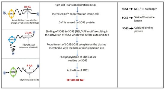 Many researchers have focused their efforts on various pathways that are activated after a plant is exposed to high salt concentrations, and it has been discovered that the salt overly sensitive (SOS) stress signaling pathway is activated in order to maintain the ionic concentration and eventually achieve salt tolerance [144] and SOS1, SOS2, and SOS3 are the three key proteins in the SOS pathway (Figure 2). Many transporters maintain Na+ homeostasis in root cells by preventing excess Na+ ions from entering the cell cytoplasm, with the SOS1 antiporter being one of the most significant [145]. SOS1 is a plasma membrane Na+/H+ antiporter/exchanger that removes excess Na+ from root cells in the rhizosphere, which is why it is necessary to reduce ionic stress. The cytosolic C-terminal tail of the SOS1 protein is 700 amino acids long and it contains a nucleotide-binding motif as well as an auto-inhibitory domain region containing a serine residue that is phosphorylated by SOS2 [146].