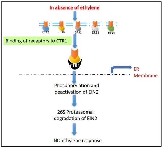 When ethylene isnot present, the receptors become active, and the function of these receptors can be controlled by a complex made up of two proteins: reversion to ethylene sensitivity 1 (RTE1) and auxin-regulated gene involved in organ size (ARGOS). They act as a negative regulator of ethylene sensitivity by positively regulating ethylene receptors [174,175]. In the absence of ethylene, active receptors have been demonstrated to bind to constitutive triple response 1 (CTR1) protein, resulting in its activation (Figure 4) [176]. A slightly higher ethylene concentration increases receptor gene transcription and stabilizes CTR1, whereas a higher ethylene concentration causes receptor/CTR1 to be destroyed by proteasome-mediated degradation [177]. When coupled to ethylene receptors, CTR1 is a serine-threonine kinase that remains activated. CTR1 phosphorylates and consequently deactivates EIN2, an endoplasmic reticulum membrane protein, in its active form. Two F-box proteins, such as ethylene insensitive 2 targeting protein 1 (ETP1) and ETP2, bind to this phosphorylated and deactivated EIN2, causing 26S proteasomal degradation of the target protein [178]. The EIN proteins are transcription factors that bind to a certain gene and change its expression, and they also carry on the signals in the ethylene signaling pathway downstream of the CTR1 protein [179].