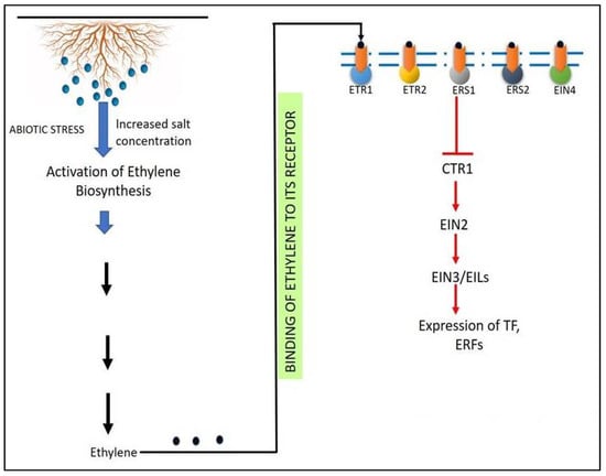 Receptors detect ethylene on the membrane of the endoplasmic reticulum. It then proceeds through a signaling pathway involving signal transduction into the nucleus, resulting in changes in the expression of genes impacted by ethylene [172]. Ethylene response 1 (ETR1), ETR2, ethylene response sensor 1 (ERS1), ERS2, and ethylene insensitive 4 (EIN4) are the five ethylene receptors studied so far in Arabidopsis. These receptors negatively regulate the ethylene signaling in various plants, and they have only been found in the presence of salinity stress [172]. At their N-terminus, all receptors feature three to four membrane-spanning helices located on the plasma membrane of the endoplasmic reticulum and these helices include the ethylene binding site [173].