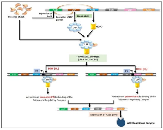 The acdS gene is regulated by several transcription factors working together. The CRP box, FNR box, acdB gene, acdR binding site, and acdR gene expressing open reading frame (ORF) were among the regulatory elements discovered in an extensively investigated Pseudomonas sp. UW4 strain [201,202,203,204]. The acdR gene (ACC deaminase regulatory gene encoding LRP protein) transcription and expression are promoted in the presence of ACC, resulting in the synthesis of LRP [190]. In its active state, LRP binds to a complex formed by ACC and glycerophosphoryl diester phosphodiesterase, both expressed by the acdB gene, to form a tripartite regulatory complex [190,204]. This tripartite regulatory complex then binds to either FNR box (if O2 levels are low) or CRP box (if O2 levels are high) and activates the acdS promoter region (P2 or P3), causing the initiation of acdS gene expression [190].