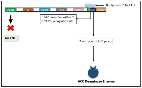 When the bacterial strains produce the ACC deaminase enzyme but the DNA sequence does not encode for an acdR gene, the transcription of the acdS gene is controlled by the nifA promoter, which is associated with transcriptional regulation of nitrogen fixation (nif) genes, as in the case of a few strains of Rhizobia and Mesorhizobium (Figure 7) [190,206]. The components present are the regulatory N2 fixing units, namely nifA1 and nifA2, which are present upstream of acdS and nifH in Mesorhizobium loti. The nifA2 promoter, which codes for the nifA2 protein, interacts with the σ54 RNA polymerase, permitting acdS transcription [197]. The nifA1 gene has also been identified to regulate acdS gene expression; however, its exact role is unknown [206]. This mechanism aids nodules containing such bacterial strains in controlling high ethylene levels, preventing senescence in the plant at an early stage [190].